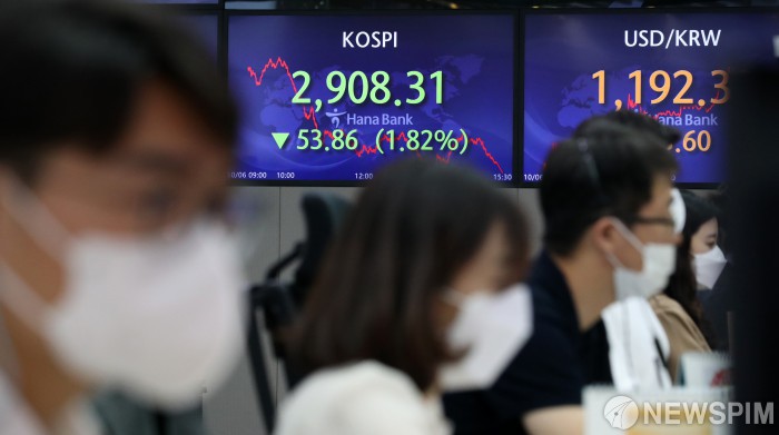 [서울=뉴스핌] 정일구 기자 = 코스피가 종가 기준 연중 최저 수준을 보인 6일 코스피 지수는 전 거래일(2962.17)보다 53.86포인트(1.82%) 내린 2098.31에 마감했다. 코스닥 지수는 전 거래일(955.37)보다 33.01포인트(3.46%) 하락한 922.36에 종료했다. 원·달러 환율은 전 거래일(1188.7)보다 3.6원 상승한 1192.3원에 장을 마쳤다. 이날 오후 서울 중구 하나은행 딜링룸에서 딜러들이 업무를 보고 있다. 2021.10.06 mironj19@newspim.com