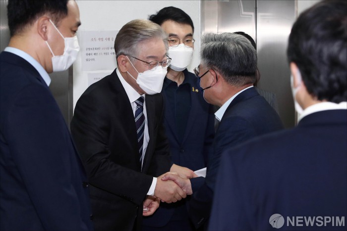 [서울=뉴스핌] 최상수 기자 = 더불어민주당 대선 경선 후보인 이재명 경기도지사가 6일 오후 서울 여의도 열린민주당 당사에서 열린 '대장동 국민의힘 게이트, 열린민주당이 묻고 이재명이 답하다' 열린민주당TV 유튜브 라이브 방송에 출연하기 위해 방문해 열린민주당 관계자들과 인사를 나누고 있다. 2021.10.06 kilroy023@newspim.com