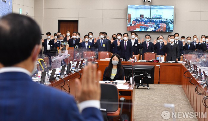 [서울=뉴스핌] 이형석 기자 = 권칠승 중소벤처기업부 장관이 7일 서울 여의도 국회에서 열린 산업통상자원중소벤처기업위원회의 중소벤처기업부에 대한 국정감사에서 선서를 하고 있다. 2021.10.07 leehs@newspim.com
