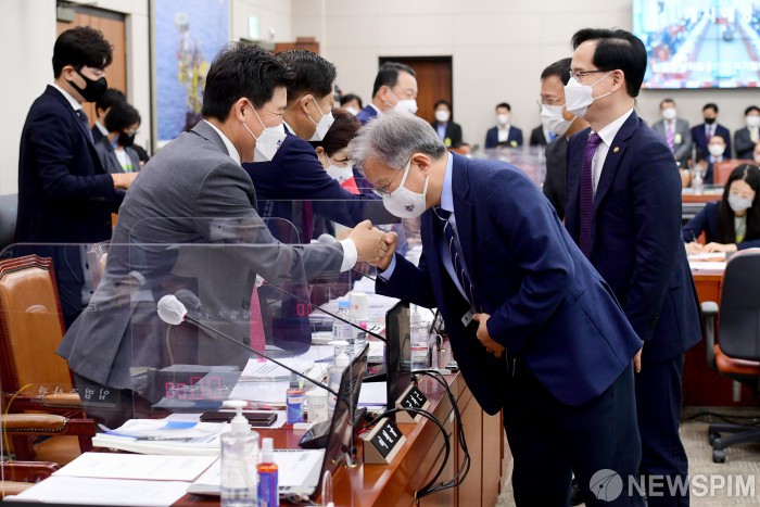 [서울=뉴스핌] 이형석 기자 = 권칠승 중소벤처기업부 장관(오른쪽)과 구자근 국민의힘 의원이 7일 서울 여의도 국회에서 열린 산업통상자원중소벤처기업위원회의 중소벤처기업부 등에 대한 국정감사에 앞서 인사하고 있다. 2021.10.07 leehs@newspim.com
