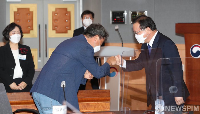 [서울=뉴스핌] 김학선 기자 = 김부겸 국무총리가 7일 서울 종로구 정부서울청사 별관에서 열린 제5차 시민사회위원회에서 위원들과 인사를 나누고 있다. 2021.10.07 yooksa@newspim.com
