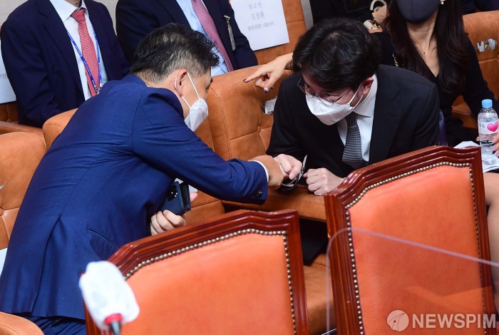 [서울=뉴스핌] 이형석 기자 = 김범수 카카오 의장(왼쪽)과 김범준 우아한형제들 대표가 7일 서울 여의도 국회에서 열린 산업통상자원중소벤처기업위원회의 중소벤처기업부 등에 대한 국정감사에 앞서 인사하고 있다. 2021.10.07 leehs@newspim.com