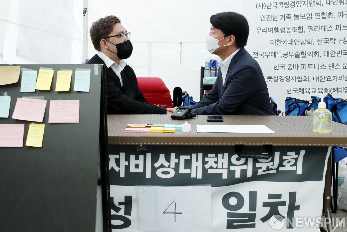 [서울=뉴스핌] 국회사진취재단 = 안철수 국민의당 대표가 10일 서울 종로구 세종로공원에 마련된 전국자영업자비상대책위원회 천막농성장을 방문해 김기홍 비대위 공동대표와 대화하고 있다. 2021.10.10 photo@newspim.com