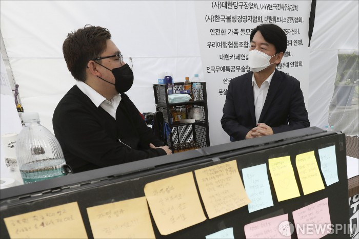 [서울=뉴스핌] 국회사진취재단 = 안철수 국민의당 대표가 10일 서울 종로구 세종로공원에 마련된 전국자영업자비상대책위원회 천막농성장을 방문해 김기홍 비대위 공동대표와 대화하고 있다. 2021.10.10 photo@newspim.com
