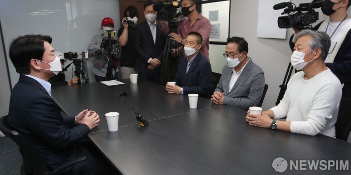 [서울=뉴스핌] 최상수 기자 = 11일 안철수 국민의당 대표가 종로빌딩 국민노동조합 사무실을 찾은 가운데 대표자들과 간담회를 갖고 있다. 왼쪽부터 안대표, 강계명 한국상점가경영자연합회장, 이희범 국민노동조합 위원장, 김준용 국민노동조합 사무총장. 2021.10.11 kilroy023@newspim.com