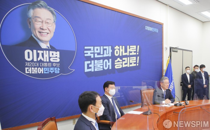 [서울=뉴스핌] 최상수 기자 = 이재명 더불어 민주당 20대 대통령 후보가 11일 국회 당대표 회의실에서 열린 당지도부-대통령후보 상견례에서 모두 발언을 하고 있다. 2021.10.11 kilroy023@newspim.com