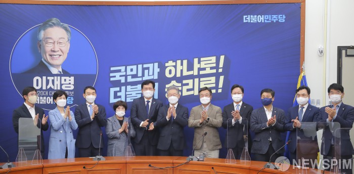 [서울=뉴스핌] 최상수 기자 = 이재명 더불어 민주당 20대 대통령 후보와 당지도부가 11일 국회 당대표 회의실에서 열린 당지도부-대통령 후보 상견례에 앞서 기념촬영을 하고 있다. 2021.10.11 kilroy023@newspim.com