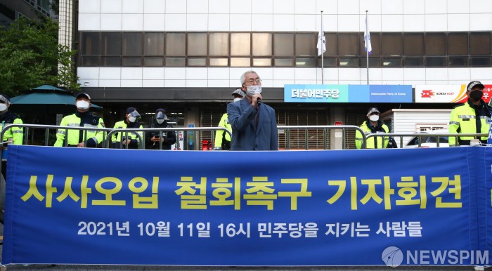 [서울=뉴스핌] 최상수 기자 = 더불어민주당 이낙연 대선 후보 지지자들이 대선 후보 경선 무표효 처리 이의제기 관련해 11일 오후 서울 여의도 더불어민주당사 앞에서 기자회견을하고 있다. 2021.10.11 kilroy023@newspim.com