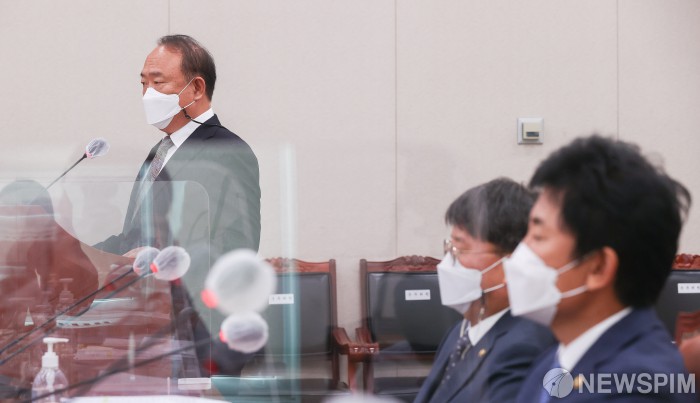 [서울=뉴스핌] 최상수 기자 = 이헌환 헌법재판연구원장이 12일 오전 서울 여의도 국회에서 열린 법제사법위원회의 헌법재판소(사무처), 헌법재판연구원에 대한 국정감사에서 업무 보고를 하고 있다. 2021.10.12 kilroy023@newspim.com