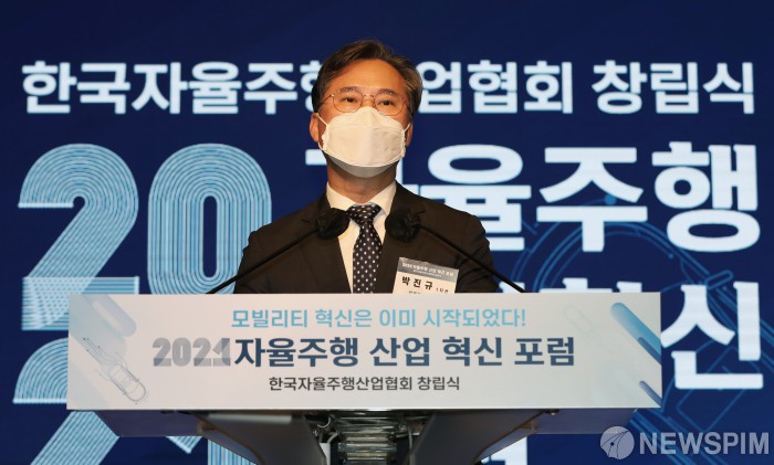 [서울=뉴스핌] 김민지 인턴기자 = 박진규 산업통상자원부 1차관이 13일 오후 서울 여의도 콘래드호텔에서 열린 한국자율주행산업협회 창립식에서 축사하고 있다. 2021.10.13 kimkimminn@newspim.com