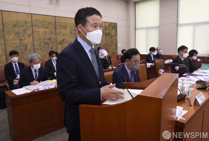 [서울=뉴스핌] 김학선 기자 = 14일 국회에서 열린 문화체육관광위원회의 한국콘텐츠진흥원 및 유관기관에 대한 국정감사에서 조현래 한국콘텐츠진흥원장이 업무보고를 하고 있다. 2021.10.14 yooksa@newspim.com