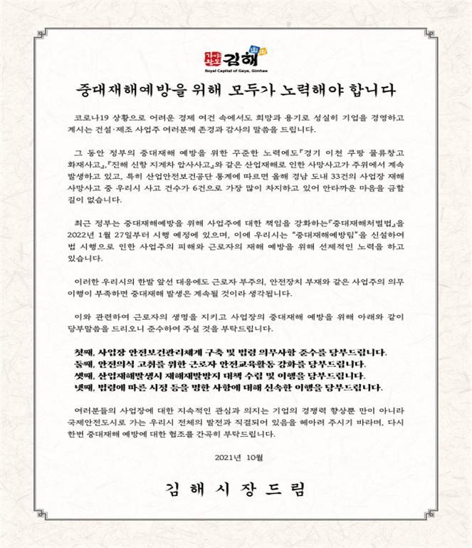 [김해=뉴스핌] 남경문 기자 = 경남 김해시는 산업재해를 근절하고 중대재해처벌법 시행(2022년 1월27일)에 대비해 건설·제조 분야 사업주를 대상으로 중대재해 예방을 당부하는 시장 명의 서한문을 발송했다고 14일 밝혔다.