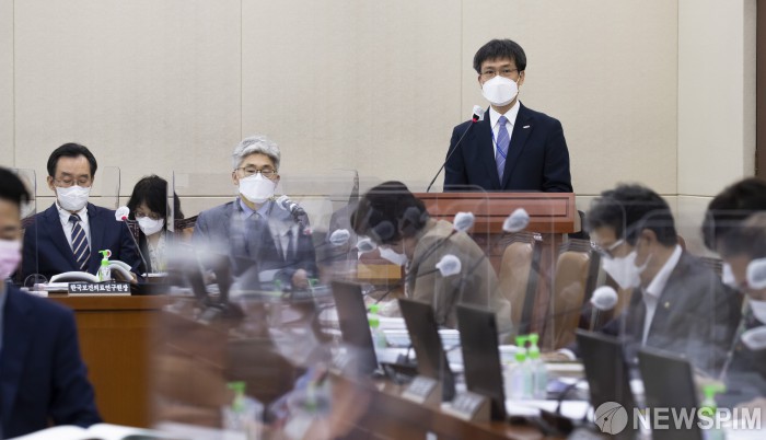 [서울=뉴스핌] 이형석 기자 = 권순만 한국보건산업진흥원장이 14일 국회 보건복지위원회 국정감사에서 업무보고를 하고 있다. 2021.10.14 leehs@newspim.com