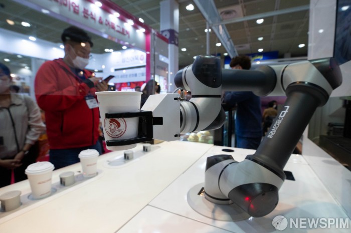 [서울=뉴스핌] 윤창빈 기자 = 14일 오후 서울 강남구 코엑스에서 열린 IFS 프랜차이즈 창업박람회의 한 업체 부스에서 로봇이 커피를 만들고 있다. 2021.10.14 pangbin@newspim.com