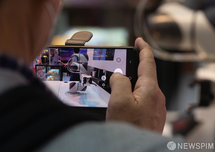 [서울=뉴스핌] 윤창빈 기자 = 14일 오후 서울 강남구 코엑스에서 열린 IFS 프랜차이즈 창업박람회에서 예비 창업자들이 부스에서 로봇이 만드는 커피를 촬영하고 있다. 2021.10.14 pangbin@newspim.com