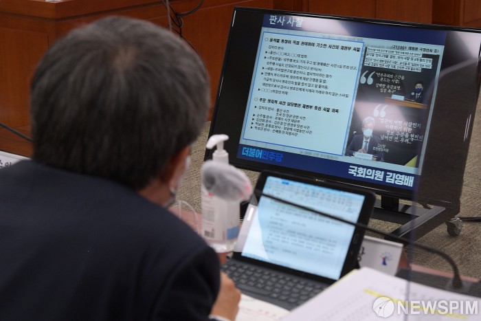 [서울=뉴스핌] 최상수 기자 = 배기열 서울행정법원장이 15일 오후 서울 여의도 국회에서 열린 법제사법위원회의 서울고등법원, 서울행정법원 등에 대한 국정감사에서 윤석열 전 검찰총장과 관련한 질의를 듣고 있다. 2021.10.15 kilroy023@newspim.com