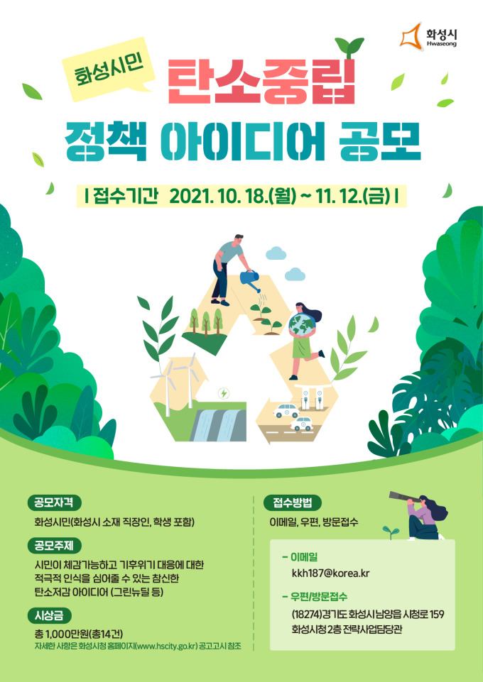 | 화성시 탄소중립 정책 아이디어 공모전 홍보물.[사진=화성시]2021.10.18 kingazak1@newspim.com |