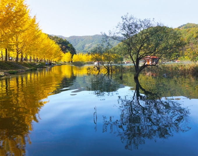 저수지에 비친 은행나무의 풍경은 찾는 이들을 감탄을 자아낸다.