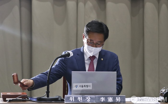 [서울=뉴스핌] 국회사진취재단 = 이헌승 위원장이 20일 서울시청에서 열린 국회 국토교통위원회의 서울시 국정감사에서 의사봉을 두드리고 있다. 2021.10.20 photo@newspim.com