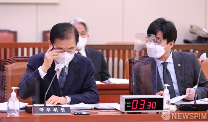 [서울=뉴스핌] 김학선 기자 = 정의용 외교부 장관(왼쪽)과 최종문 제2차관이 20일 국회에서 열린 외교통일위원회의 외교부에 대한 국정감사에서 자료를 살펴보고 있다. 2021.10.20 yooksa@newspim.com