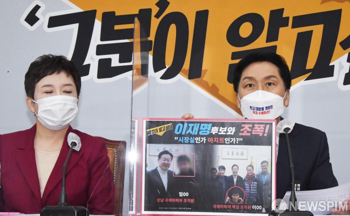 [서울=뉴스핌] 최상수 기자 = 김기현 국민의힘 원내대표가 21일 오전 서울 여의도 국회에서 열린 최고위원회의에서 이재명 더불어민주당 대통령선거 후보와 조폭연관설을 주장하고 있다. 2021.10.21 kilroy023@newspim.com