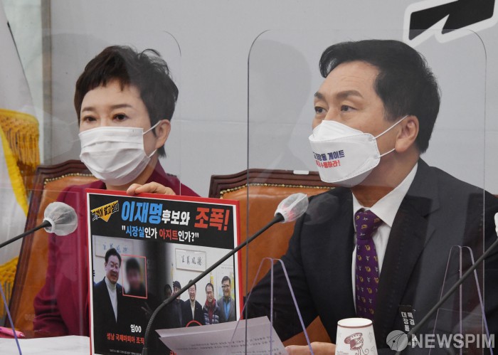 [서울=뉴스핌] 최상수 기자 = 김기현 국민의힘 원내대표가 21일 오전 서울 여의도 국회에서 열린 최고위원회의에서 이재명 더불어민주당 대통령선거 후보와 조폭연관설을 주장하고 있다. 2021.10.21 kilroy023@newspim.com