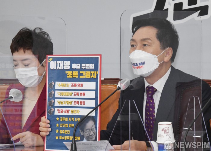 [서울=뉴스핌] 최상수 기자 = 김기현 국민의힘 원내대표가 21일 오전 서울 여의도 국회에서 열린 최고위원회의에서 이재명 더불어민주당 대통령선거 후보와 조폭연관설을 주장하고 있다. 2021.10.21 kilroy023@newspim.com