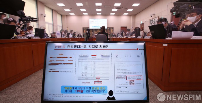 [서울=뉴스핌] 최상수 기자 = 이용 국민의힘 의원이 21일 서울 여의도 국회에서 열린 문화체육관광위원회 국정감사에서 BTS 유엔 특사 비용 관련 질의를 하고 있다. 2021.10.21 kilroy023@newspim.com