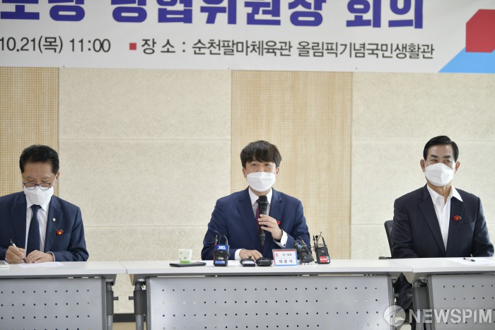 [순천=뉴스핌] 전경훈 기자 = 21일 오전 전남 순천시 순천팔마종합운동장 올림픽기념국민생활관 내 사무실에서 이준석 국민의힘 대표가 취재진 질문에 답하고 있다. 2021.10.21 kh10890@newspim.com