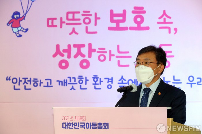 [서울=뉴스핌] 권덕철 보건복지부 장관이 23일 오전 서울 종로구 아동권리보장원에서 '따뜻한 보호 속, 성장하는 아동' 주제로 열린 2021년 제18회 대한민국 아동총회 개회식에서 축사를 하고 있다.[사진= 보건복지부 ] 2021.10.23 photo@newspim.com