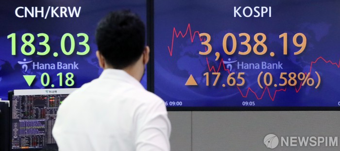 [서울=뉴스핌] 김민지 인턴기자 = 코스피가 전 거래일(3020.54)보다 19.28포인트(0.64%) 오른 3039.82로 시작한 26일 오전 서울 중구 하나은행 딜링룸에 지수가 표시돼 있다. 이날 코스닥지수는 전 거래일(994.31)보다 6.01포인트(0.60%) 오른 1000.32에 개장했고, 원·달러 환율은 전 거래일(1168.4)보다 0.4원 내린 1168.0원에 문을 열었다. 2021.10.26 kimkim@newspim.com