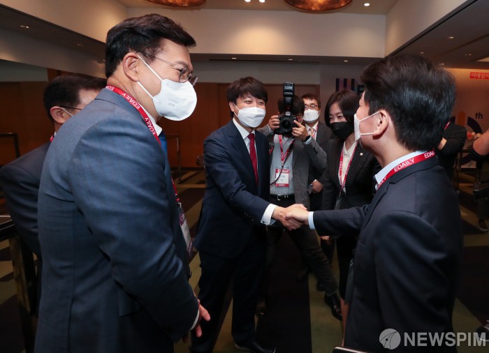 [서울=뉴스핌] 국회사진취재단 = 이준석 국민의힘 대표(왼쪽 두번째)와 안철수 국민의당 대표가 26일 서울 강남구 인터컨티넨탈 서울 코엑스에서 열린 '제10회 이데일리 W페스타'에 참석해 인사를 나누고 있다. 왼쪽은 송영길 더불어민주당 대표. 2021.10.26 photo@newspim.com