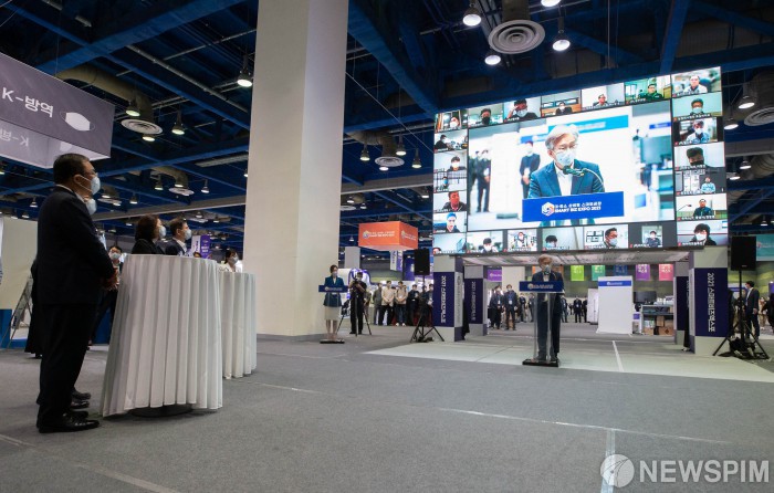 [서울=뉴스핌] 윤창빈 기자 = 권칠승 중소벤처기업부 장관이 27일 오후 서울 강남구 코엑스에서 열린 2021 스마트비즈엑스포에서 격려사를 하고 있다. 2021.10.27 pangbin@newspim.com