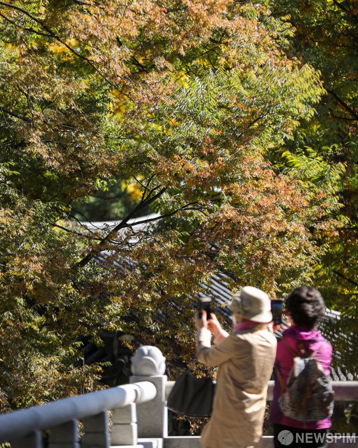 [서울=뉴스핌] 황준선 인턴기자 = 맑은 날씨를 보인 28일 오후 서울 성북구 길상사를 찾은 시민들이 가을빛으로 물들어가는 단풍들을 보며 즐거운 시간을 보내고 있다. 2021.10.28 hwang@newspim.com