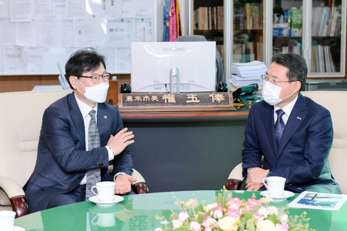 | 강성국 법무부 차관(사진 왼쪽) 권오봉 시장과 환담 [사진=여수시] 2021.10.28 ojg2340@newspim.com |