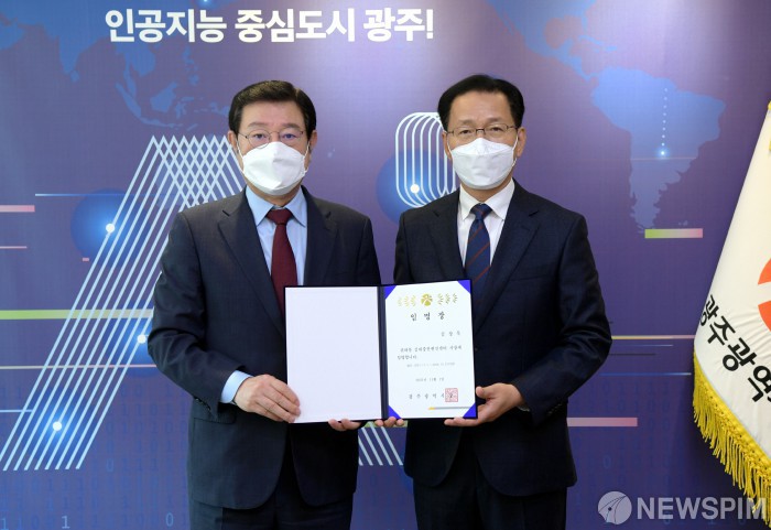 [광주=뉴스핌] 전경훈 기자 = 이용섭 광주시장이 29일 오전 시청 접견실실에서 신임 김상묵 김대중컨벤션센터 사장에게 임명장을 전달한 후 기념촬영을 하고 있다. 2021.10.29 kh10890@newspim.com