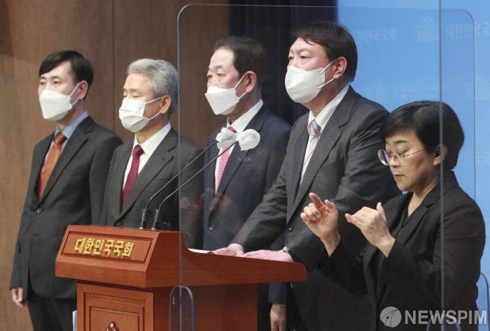 [서울=뉴스핌] 이형석 기자 = 윤석열 국민의힘 대선 경선 후보(오른쪽 두번째)가 29일 오후 서울 여의도 국회 소통관에서 열린 박주선 전 국회부의장과 김동철 전 국회의원의 지지선언 기자회견에서 발언하고 있다. 2021.10.29 leehs@newspim.com