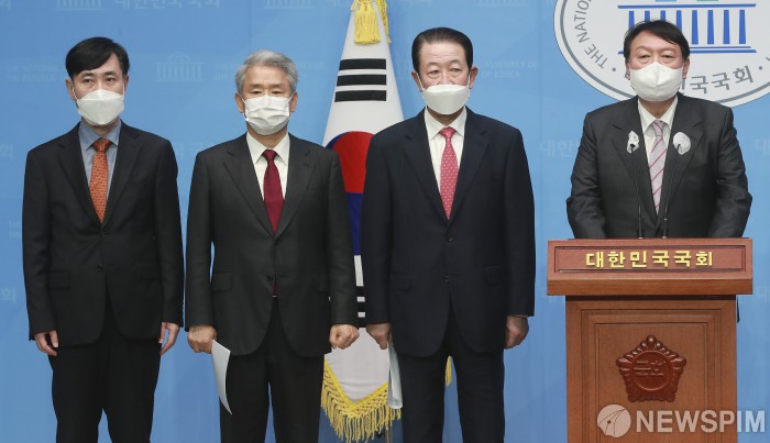[서울=뉴스핌] 이형석 기자 = 윤석열 국민의힘 대선 경선 후보(오른쪽)가 29일 오후 서울 여의도 국회 소통관에서 열린 박주선 전 국회부의장과 김동철 전 국회의원의 지지선언 기자회견에서 발언하고 있다. 2021.10.29 leehs@newspim.com