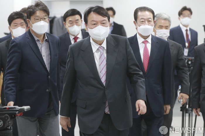 [서울=뉴스핌] 이형석 기자 = 윤석열 국민의힘 대선 경선 후보가 29일 오후 서울 여의도 국회 소통관에서 박주선 전 국회부의장과 김동철 전 국회의원의 지지선언 기자회견을 위해 입장하고 있다. 2021.10.29 leehs@newspim.com