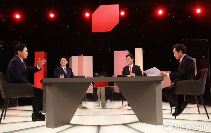 [서울=뉴스핌] 국회사진취재단 = 31일 오후 서울 여의도 KBS본관 스튜디오에서 열린 국민의힘 제20대 대선 경선후보자 10차 토론회에서 원희룡(왼쪽부터), 윤석열, 유승민, 홍준표 후보가 토론 시작 전 대화를 나누고 있다. 2021.10.31 photo@newspim.com