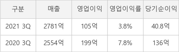 ◆ 3Q 실적, 매출액 2781억원 전년동기 대비 8.9% 증가... 영업이익 47% 감소