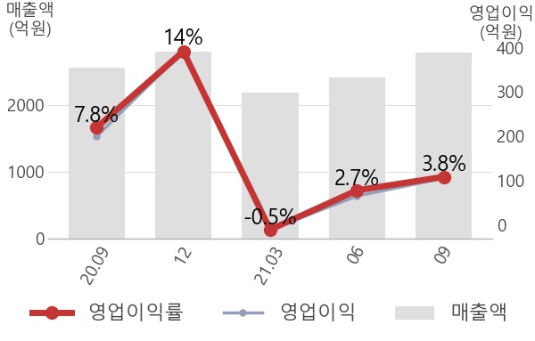 영업이익률을 자세히 살펴보면, 매출은 2781억으로 전년동기 대비해서 8.9% 증가한 반면, 영업이익은 105억으로 47% 감소하였다. 매출은 증가하고 영업이익은 감소하여 영업이익률은 하락하였다.