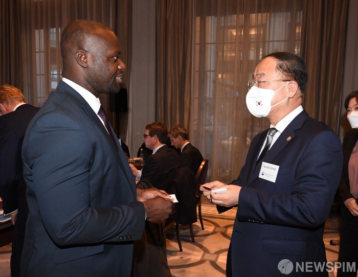 [서울=뉴스핌] 홍남기 부총리 겸 기획재정부 장관이 1일(현지시간) 영국 런던 코린시아 호텔에서 열린 한국경제설명회(IR)를 개최, 행사 시작에 앞서 투자자들과 인사를 하며 환담을 나누고 있다. [사진=기획재정부] 2021.11.02 photo@newspim.com