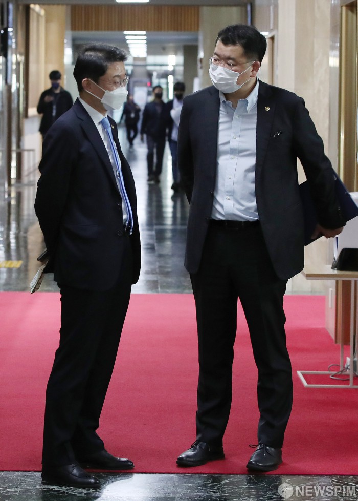 [서울=뉴스핌] 정일구 기자 = 이억원 기획재정부 제1차관(왼쪽)과 최종건 외교부 제1차관이 2일 오전 서울 종로구 정부서울청사 복도에서 대화를 나누고 있다. 2021.11.02 mironj19@newspim.com