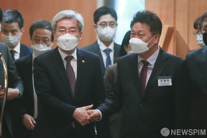 [서울=뉴스핌] 이형석 기자 = 고승범 금융위원장(왼쪽)이 3일 오전 서울 중구 소공동 롯데호텔에서 열린 '금융위원장 - 보험업계 간담회'에 민병두 보험연수원 원장과 악수를 하며 들어서고 있다. 2021.11.03 leehs@newspim.com