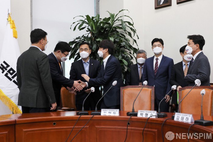 [서울=뉴스핌] 최상수 기자 = 3일 국회에서 열린 국민의힘 '이재명 비리 국민검증특별위원회' 임명장 수여식에서 이준석 대표(가운데)와 김진태 이재명 비리 국민검증 특별위원회 위원장(오른쪽)이 특위 위원들과 인사를 나누고 있다. 2021.11.03 kilroy023@newspim.com