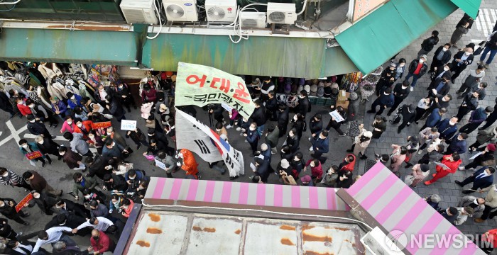 [서울=뉴스핌] 국회사진취재단 = 윤석열 국민의힘 대선 경선 후보 지지자들이 3일 오전 서울 중구 남대문시장에서 윤석열 연호를 외치며 윤대표를 따라 다니고 있다.