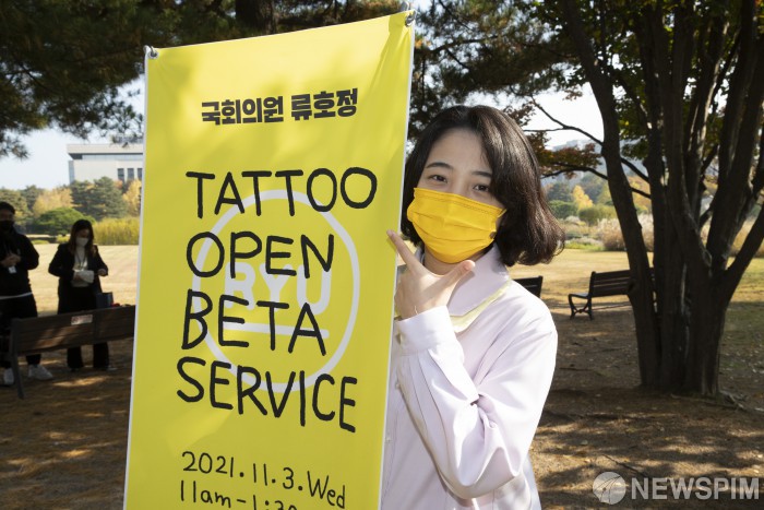 [서울=뉴스핌] 최상수 기자 = 지난 6월 타투업을 합법화하는 내용의 법안을 발의한 류호정 정의당 의원(왼쪽)이 3일 국회 의원회관 앞에서 열린 타투 오픈베타서비스 행사에서 포즈를 취하고 있다. 2021.11.03 kilroy023@newspim.com