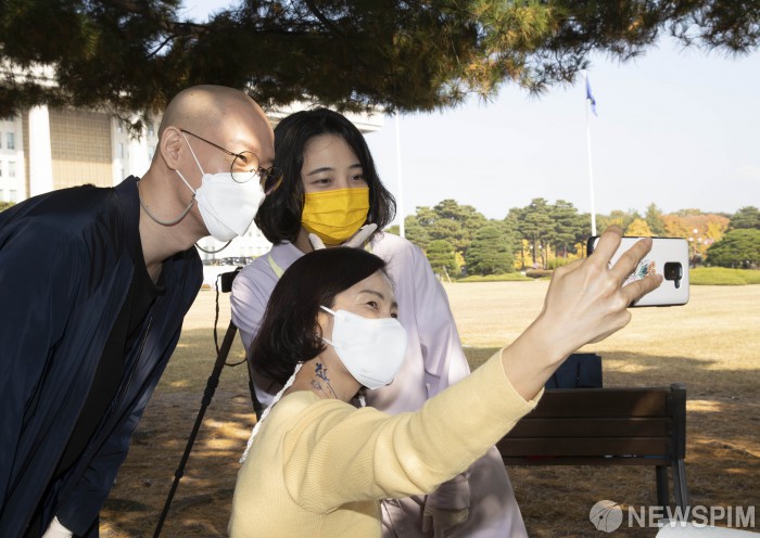 [서울=뉴스핌] 최상수 기자 = 류호정 정의당 의원(오른쪽)이 3일 국회 의원회관 앞에서 열린 타투 오픈베타서비스 행사에서 기념촬영을 하고 있다. 2021.11.03 kilroy023@newspim.com
