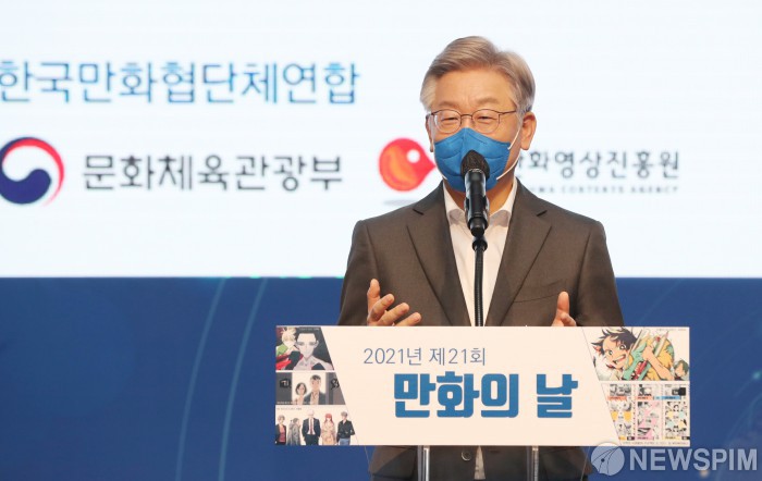 [부천=뉴스핌] 국회사진취재단 = 더불어민주당 이재명 대선 후보가 3일 경기도 부천시 한국만화박물관에서 열린 제21회 만화의 날 기념식에 참석해 축사를 하고 있다. 2021.11.03 photo@newspim.com